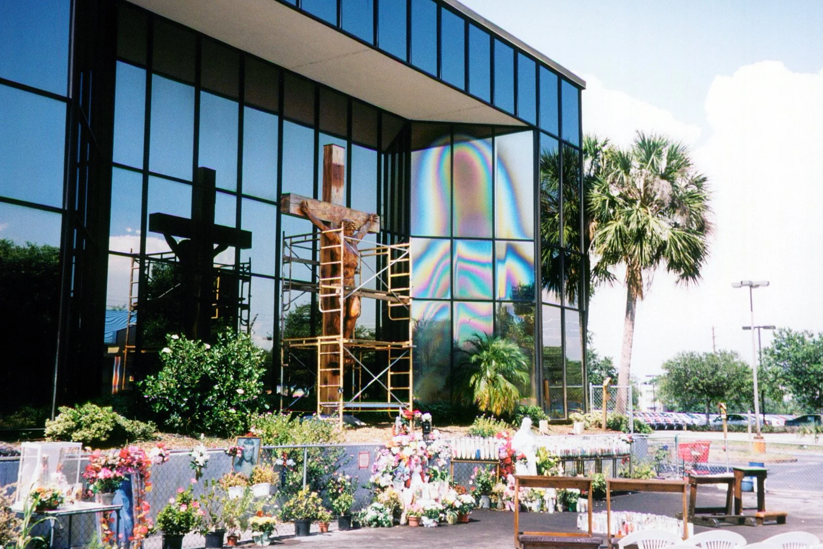 Today I saw the Virgin Mary, on Highway 19 in Clearwater, a miraculous vision of the Virgin Mary, her rainbow-hued silhouette reflecting eerily off the glass windows of the international-style bank. Usually one has to squint or stretch the boundaries of representation to see those Madonnas on the walls, or those Jesuses in the tortillas, but this Mary was as clear as the olive in my martini glass, and luminous and beautiful.