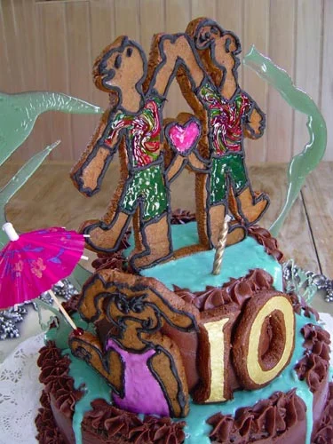 So we celebrated Reese's 10th birthday this weekend. I don't want him to get older. I don't want to get older. Double digits already, he'll be wanting the car keys in no time. The party that we threw for him in Golden Gate Park could have been thrown by Dario Argento—yellowjackets stung all the screaming kids, a seagull tried to eat the cake, several bees became embedded in it, and Angie and Megan forgot the table. Reese came through with a surprise pop quiz which he passed out to everyone titled "How well do you know Reese?" He even designed his cake this year, which always takes several days for us to execute, based on his own "Uffy Club" comic strip, destined to be a classic, starring Fluffy and Ruffy (a cat and a dog), and Muffy BeautyButt (a poodle). Fluffy and Ruffy are holding hands on the top of the cake, their friendship a source of the fountain, which rains down on poor Muffy, holding the umbrella, and spills down the levels of the cake. Ever the sissy daddy, and an easy target, I quietly slipped out during the water balloon toss.