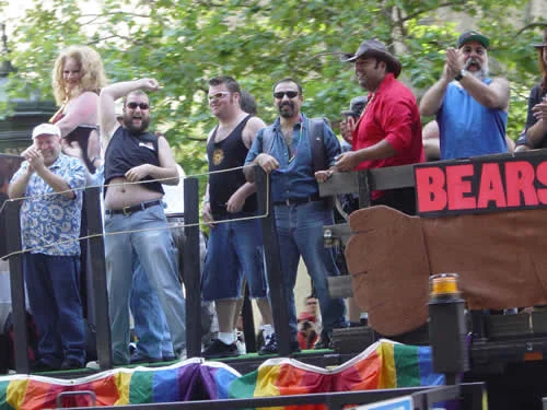Sunday Big Chris, Little Dave in from Sydney for a few days, and I, did (to use the Australian verb again) the gay parade and celebration. The Bears of SF were happy and bouncy and hot as, well, a truckload of bears. Then dinner with my brother and sisters, and dancing at Planet Big at the STUD where we hugged, bumped, and/or danced withKeanunear, Mamooshka and John, Kris and Truckerfucker, and Nick Dong. I wanted to take the go-go bear in the red jockstrap dancing in the cage above the dance floor home with me, but I'd be afraid to let him out of his cage. We were delighted to be treated to a private sex show in the back, which got kind of strange at one point, when Naked Exhibitionist Guy suddenly jumped off the lap of his poor would-be suitor and said something like "Don't touch me" and took off. I didn't think there were any breeches of etiquette to warrant such a disruption. We were pretty speechless. I mean, wouldn't one assume when a person takes off his clothes and sits on a lap that it's because he wants to be touched?