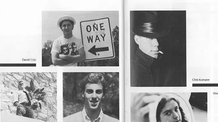 Here's David's picture in the yearbook. I was the layout editor and the photographer, so in my first stab at visual narration, I tried to indicate that the only way to his heart was through me. I was the detective, trying to find the way in, while he stood there guarding his pearl beyond all price. That's Wendy, below me, in the looking glass, my girlfriend and best buddy (although she didn't make it to the reunion), representing the illusion of love.