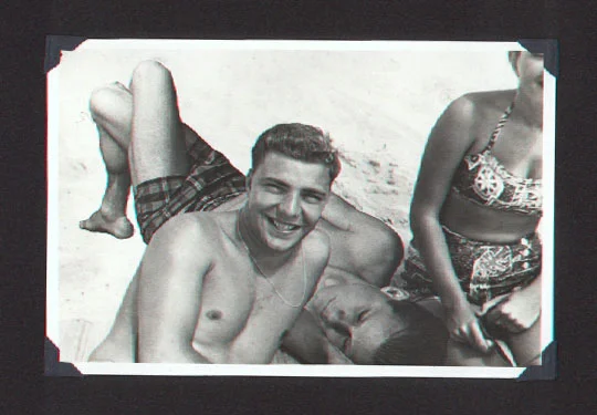 In college I made a series of images in which I placed myself in his family photos, taken when he was around my age. (This was before photoshop, so the montage was deliberately sloppy, to draw attention to my imposition into his life.) The final image in the series shows us on the beach, Manny looking right into the camera, my Burt Lancaster, and me lying at his side, my cheek against his arm, imagining that his warmth would never end.
