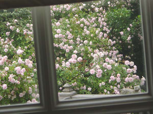 The roses are blooming, the roses are blooming. Here's a view outside of my bedroom window, taken this morning. The roses were planted by a previous owner of my house, possibly as long ago as when the house was built, in 1931. I have been sculpting them over the years into a sort of arbor that extends overhead when walking up the side steps of the garden. They continue in a massive pink cloud that extends up into my hawthorne, which I climb every winter when I head back the canes. The canes can grow as much as 10 feet in a season.