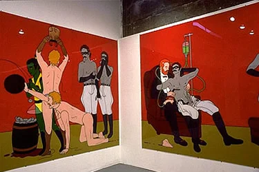 After the elegant installation by Robert Kusmirowski, The Museum of the Last Artwork, we made our way upstairs to David Cannon Dashiell's epic mural, Queer Mysteries. Now you baby gays need to go see this show. I followed David's work in the late 80's, up to the first showing of the mural at the San Francisco Art Institute in 1993, just a few weeks before he died. It's a comic tour-de-force queer sci-fi rendering of the murals at the Villa of the Mysteries in Pompeii.