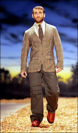 ...Mr. Varvatos's challenge to the status quo for men was meek in comparison with that of John Bartlett, who based his collection on a hairy and hypermasculine segment of the gay population known as "bears," and within that category of manly gay men, a subset that paradoxically likes fashion. As Mr. Bartlett described the clothes—including a loden cashmere peacoat and see-through merino wool long johns he set to a dance remix of the music from "Brokeback Mountain"—what makes them more appealing than, say, an affordable wool jacket from Pendleton, is that "even the most butch of creatures love luxury."