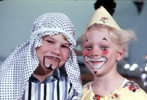 My little brother Mark turned 40 last month. We're now the same age until November. He was like my twin growing up, we were in the same grade and everything. His buddies threw a big party that went until 6 in the morning, a rollicking affair with a "roast" by his friends, dancing and much merrymaking. Here we are as kids, the sheik and the clown.