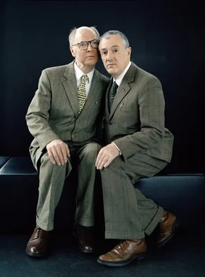 On Sunday BC and I had lunch with my sister DiDi at the deYoung and toured the Gilbert & George show. I just love them. So much of their work makes me laugh and gigggle and squirm and think. There are a few vitrines at the end of the show that display early work, when they thought of themselves and their actions as sculpture. They had this really brief moment of figuring out what they were going to do, and bam, they've been doing it ever since—for 40 years, and in the same outfits and in the same neighborhood and the same bodies. Their art is an art for the masses, that you can think about as much or as little as you want or need to, like stained glass windows made out of hand-painted photos. And gay! Not liking their work is like kicking a poodle.