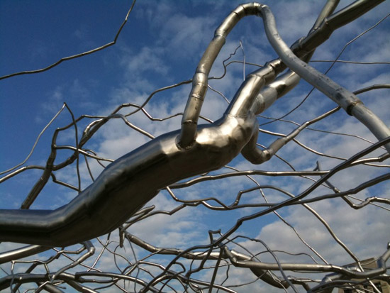 On the roof, Roxy Paine created a jumble of welded stainless steel tree-like trunks and limbs, meandering all over the roof garden, a glimmering aesthetic briar patch.