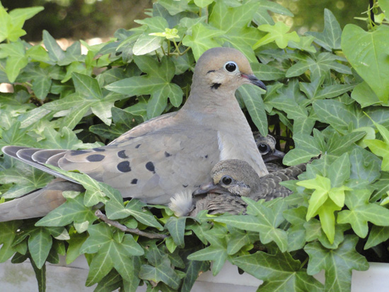 A pair of mourning doves made a nest in a planter of ivy on my parents' deck last month, laying two eggs. Shortly before I arrived to visit with my folks in Birmingham, the eggs hatched. Every day we watched the parents feed the quickly growing chicks with their crop milk. The whole family seemed fine with us sitting only a few feet away, enjoying our iced tea while they regurgitated and pooped, wiggled their wings, and sang us their mournful tunes.
