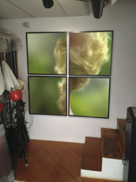 On the left is a photo of one of my new pieces, hanging in my studio—Bud. It's of my Foreign Correspondent's head, the day he bleached it blonde and ran off to the Folsom St. Fair in leather chaps and a rash.