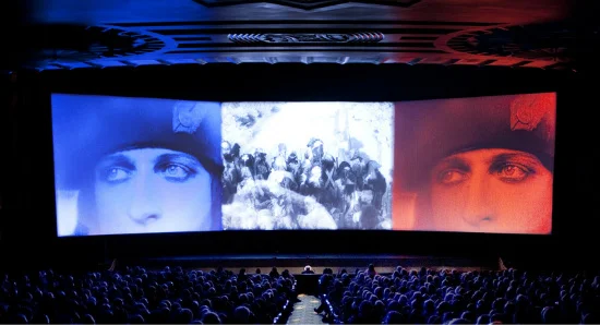 There are so many many scenes like this, some calm, framed almost like tableaux, others visceral, the camera probing and roving. For the final hour-long sequence, presented in "Polyvision," curtains on either side of the screen slide back, revealing two more screens, tripling the size of the viewing plane. He uses this space in probably as many ways as you could imagine, ways that were not utilized until Cinemascope in the 50s and only recently in artists' video installations. There are scenes where the images on all three screens come together in a nearly seamless panorama, the foreground and background utilized dynamically, with horses and soldiers traversing diagonally across the screens. Other sequences are presented with a single image of Napoléon in the center, his advancing troops marching towards the camera on the adjacent screens. Sometimes the flanking images are flipped, sometimes there are three different sequences playing at once, one close up, the other a landscape, yet another an eagle, a zealous admirer.