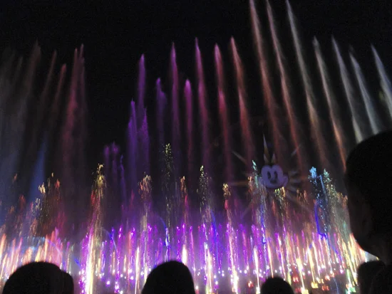 We dined in Ariel's Grotto, outside by the water, romantic, in the only table with no heat overhead. So I shivered through my meal, warmed visually by Señor Grant's fiery countenance. After dinner we made our way through several heated indoor attractions and then, suitably warmed, hopped over to the other side of the lake to see the World of Color show, "the WOOON-derful world of COOOOOO-loooooooor!" in which scenes from recent Disney films are projected on eruptions and sprays of water. Despite the signs everywhere warning that the area we were in was a "wet" zone, Señor Grant insisted that it was "only a mist." When our neighbors expressed concern about getting wet, he calmed them with "it's only a light mist." The show was dazzling, the colored jets of water zigging and zagging, the fountains growing higher and higher... and then came the deluge. Which didn't stop. Everyone around started screaming, I ducked behind Señor Grant but to no avail. We were soaked. I tried to avoid the angry stares of my wet neighbors, glaring at Señor Grant.
