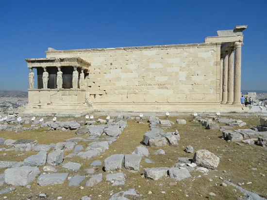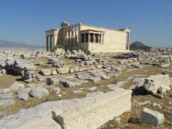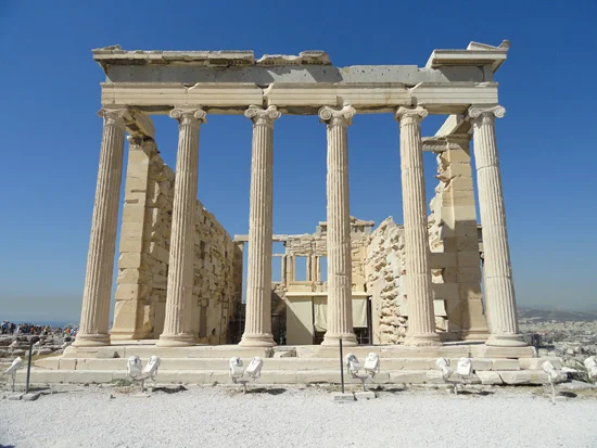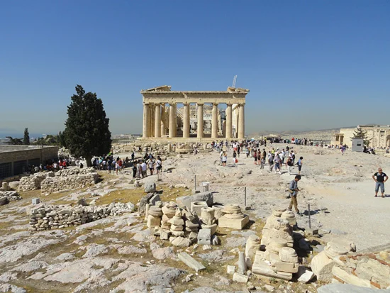I visited the Acropolis yesterday, completely wowed by the intensive reconstruction and restoration work that's happened since my last visit in 2001. It's like the ultimate jigsaw puzzle up there, chunks of Parthenon everywhere, slowly being fitted into place. I managed to arrive just as everybody else did, at the time that every guide book says to avoid, late morning before lunch. The place was packed for an hour, and then everyone scurried down the hill to his air-conditioned tour bus.