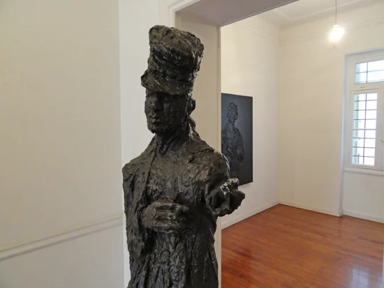 In Wyatt Kahn and Wesley Martin Berg's installations in a 19th century apartment building, the space was left untouched, the crumbling details of the building—wall trim, mosaic floors, lovely old doors and windows—creating a visually charged domestic backdrop for their enigmatic and intriguing forms. Kahn makes polyagonal canvases that are bolted together into single rectangular picture planes. Berg presented sculptures and paintings based on a single hobo-like figure, each work formed from gloppy black neo-expressionist strokes. The confident messiness of their gestures seemed well-suited to the dilapidated beauty of the building.