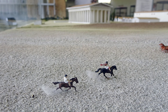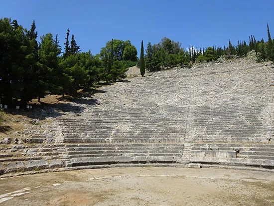 After visiting the theater at Argos we visited the temple and stadium at Ancient Nemea. The site has been funded, excavated and restored by a team from the University of California at Berkeley. It's the only archaeological site I've been to that has a rose-lined path, grass, a ha-ha, actual "Watch your step!" signs, and plaques everywhere with the names of Greek-American project sponsors. Even the marble picnic table had a sponsor's name carved into it!