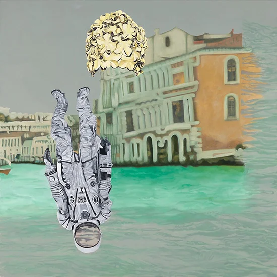A particular favorite of mine, DIvr, has as a backdrop a blurry image of a few buildings on the Venetian lagoon. In the foreground, in sharp focus, are an upside down astronaut, the sea reflected in his silvery helmet, and above him a woman's bathing cap, one of those fabulous mid-20th-century architectural rubber floral helmets that Esther Williams would have worn, removing it to reveal a perfectly coifed shimmery Technicolor 'do. The background image dissolves on the right side of the canvas into a different plane of reflected lagoon water. The slight shifts in focus and perspective within the same canvas create a kind of soft Cubist space, but instead of letting us view an object from many perspectives within one picture plane, Sarah fills her painting surface with beautifully rendered psychologically rich images of different cultural and technological signifiers.