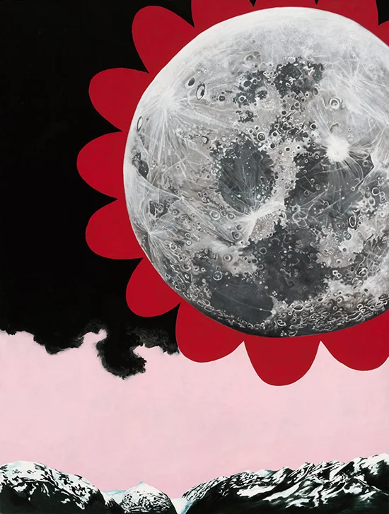 You could call her a lunatic, hahaha... One painting titled Menas, presents the moon as menace, seemingly entering the earth's atmosphere—the sky is pink, the clouds black and brooding—yet the moon has these red blossoms around it, like a flower a kid would paint, and the surface of the moon so beautifully bright and crisply clear. If she can't get to the moon just yet, the moon is finally coming to her, and in humanity's end, she finds nothing but delight and wonder.
