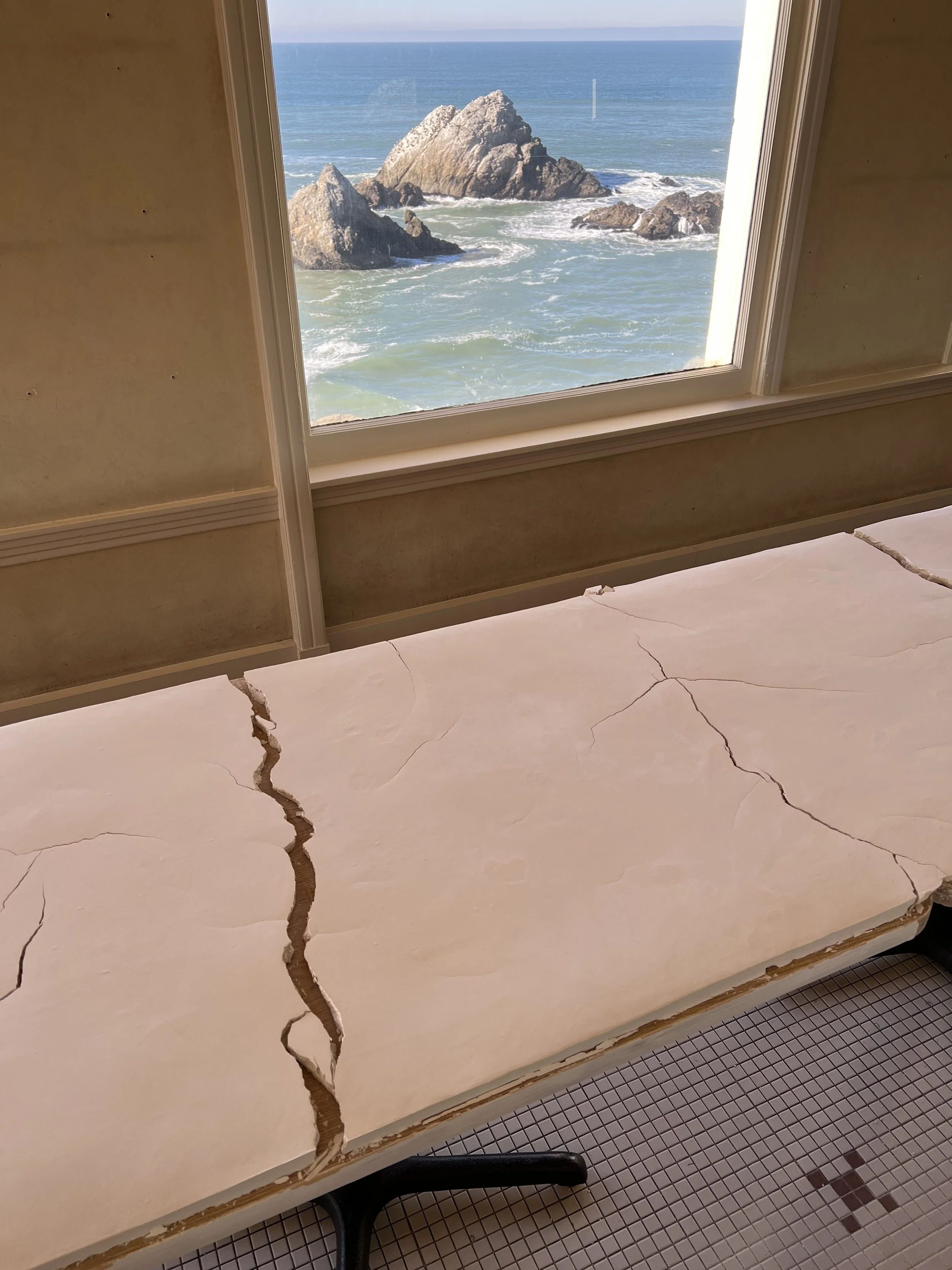 Andy Goldsworthy coated a single long table and adjacent dining booth tabletops with a thick layer of white clay. As the show has progressed, the white clay tablecloths have cracked, like dry riverbeds, or overbaked meringues, our current drought conditions in California rendered as conceptual frosting.